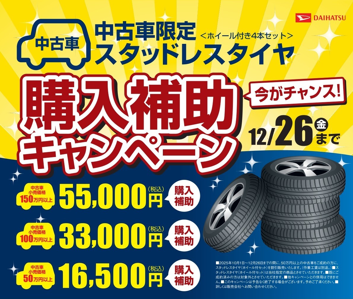 長野ダイハツ販売では 中古車をご購入のお客様に、スタッドレスタイヤ購入補助キャンペーン を実施中です。