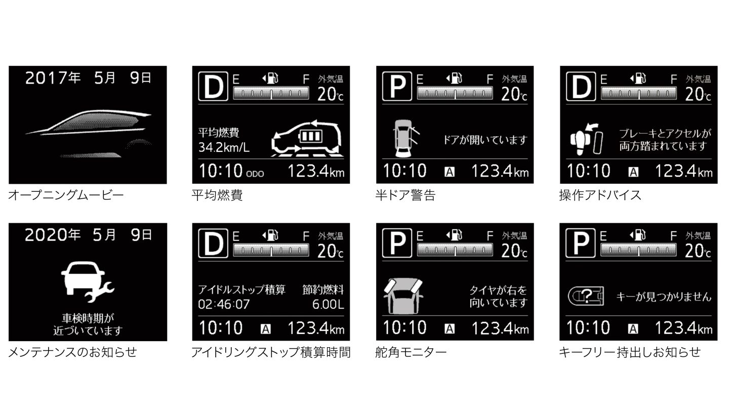 平均燃費のほか、アイドリングストップの積算時間や、それにより節約できた燃料量、メンテナンスのお知らせなど多彩な情報を、見やすい大型の液晶画面に表示します。