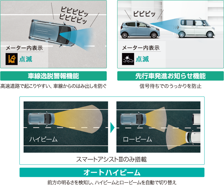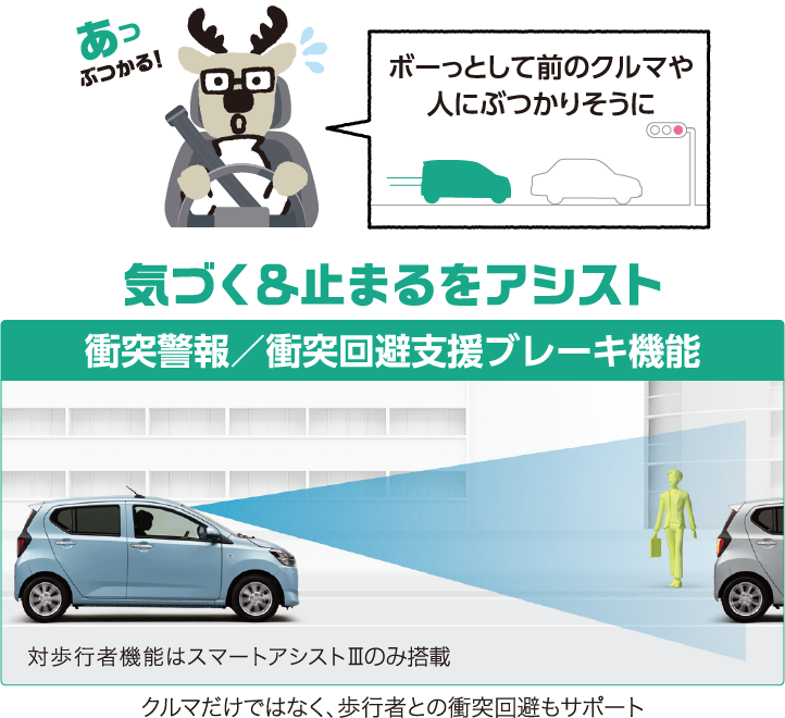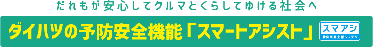 ■スマートアシストに頼った運転は絶対に行わないでください。スマートアシストは、ドライバーの判断を補助し、事故被害や運転負荷の軽減を目的としています。わき見運転やぼんやり運転などドライバーの前方不注意を防止したり、悪天候時の視界不良下での運転を支援する装置ではありません。また、あらゆる状況での衝突を回避するものではありません。運転時は常に先行車や歩行者との距離や周囲の状況、運転環境に注意して必要に応じてブレーキペダルを踏む、ステアリングを操作するなど安全運転を心がけてください。■スマートアシストの認識性能・制御性能には限界があります。ドライバーの運転操作、急カーブ、急勾配、雨等の道路状況、および天候によっては、システムが作動しない、または作動が遅れる場合があります。■雪、濃霧、砂嵐の場合や、トンネル内、夜間、日射しの状況によってはステレオカメラ、ソナーセンサーが障害物などを正常に認識できず、適切に作動しない場合があります。■作動条件下であっても、システムが作動しない場合があります。■このほか、スマートアシストについて重要な注意事項が記載されておりますので、詳しくは取扱説明書をご覧ください。■スマートアシストの詳細は販売店にお問い合わせください。