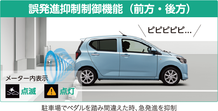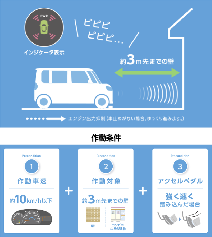 ■ペダル踏み間違い時加速抑制機能には限界があります。加速抑制機能に頼らず安全運転を心がけてください。加速抑制機能は衝突を回避するものではありません。発進時はシフトレバーやペダルの位置および周囲の安全を十分に確認して操作してください。機能に頼っていると、思わぬ事故につながり、重大な傷害におよぶおそれがあります。 ■加速抑制機能は停止状態を保つものではありません。 ■加速抑制機能は、車速約10km/h以下で、約3m以内に障害物がある状態で、アクセルペダルを強く速く踏み込んだ場合に、エンジン出力を抑制します。 ■条件の違いにより、加速抑制機能が作動しないことがあります。詳しくは取扱説明書をご覧ください。 ■衝突の可能性がなくても加速抑制機能が作動する場合があります。詳しくは取扱説明書をご覧ください。 ■ペダル踏み間違い時加速抑制装置の詳細については、販売会社にお問い合わせください。