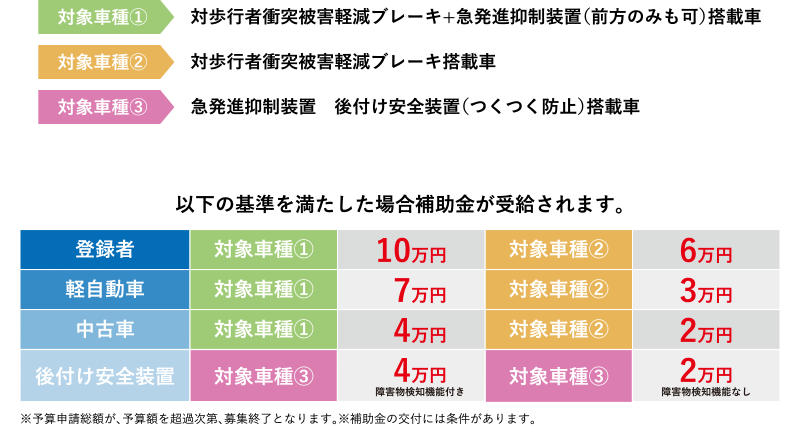 サポカー補助金は、65歳以上の高齢運転者が衝突被害軽減ブレーキなどを装備した対象新車の購入を申請すると交付されます。2022年3月31日までに満65歳以上となる方を対象に(令和3年度分の対象者)①対歩行者衝突被害軽減ブレーキ搭載車②ペダル踏み間違い急発進抑制装置搭載車上記のサポカー①のみ、または①かつ②を搭載する車両の購入に補助金が適応されます。