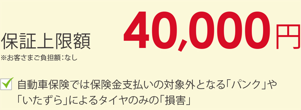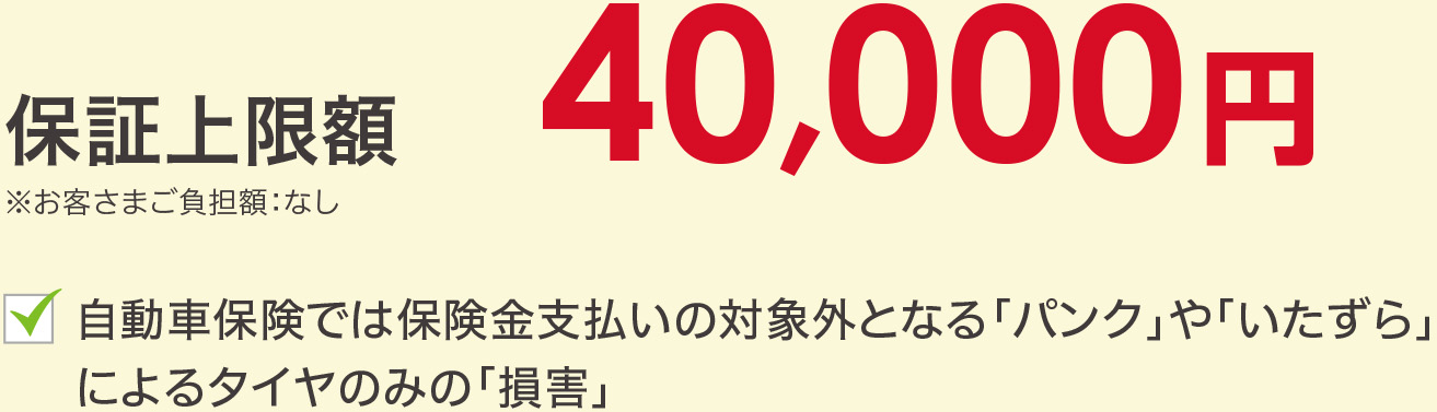 車検有効期間の初日から次回車検満了日の24時までに発生した「走行時」「いたずら」によるタイヤの単独損害に限度額を上限に新品交換サポート