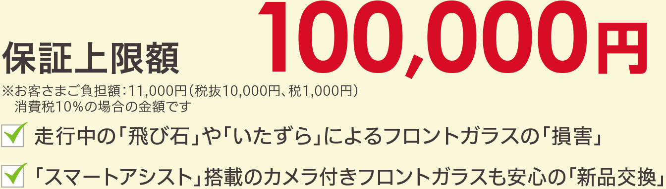 車検有効期間の初日から次回車検満了日の24時までに発生した飛び石等の損害による、フロントガラスの修理・交換を限度額を上限にサポート