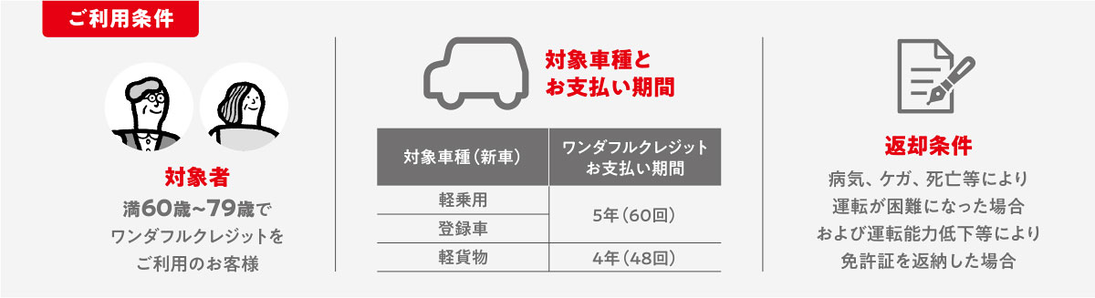 - 満60歳~79歳で、軽乗用・登録車はワンダフルクレジット5年を、軽貨物はワンダフルクレジット4年をご利用いただいたお客様がご加入いただけます。