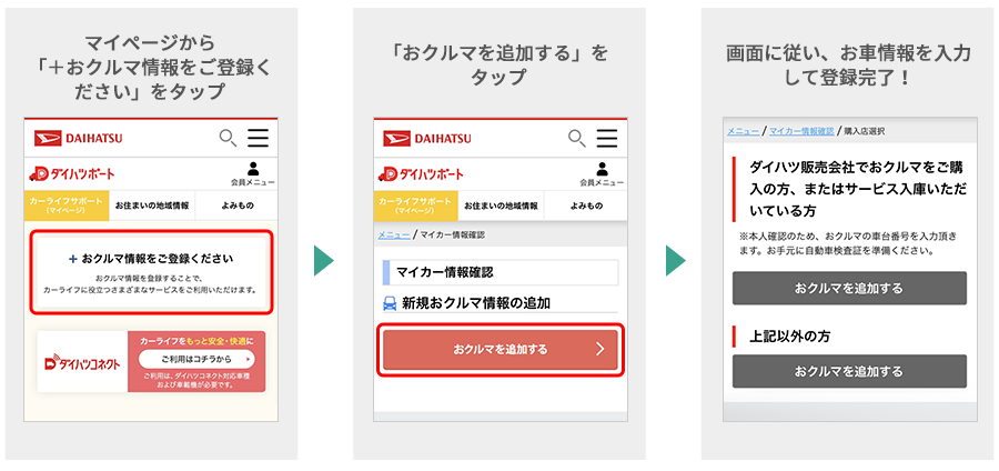 • マイカー情報の登録はスマートフォンからのみ行えます。パソコンからは追加できませんのでご注意ください。